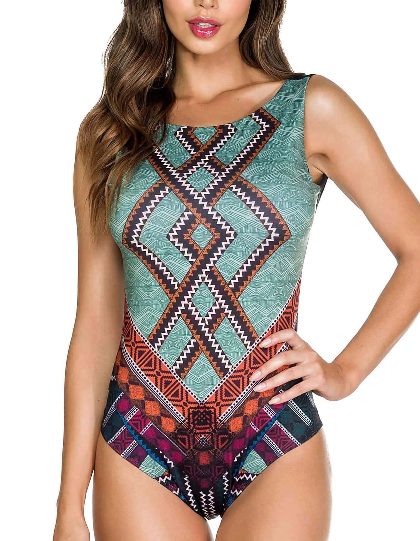 Bonito bañador o body de Maryssil de cuello redondo con estampado étnico en la parte frontal y elegante parte de atrás en negro liso con espalda al aire.