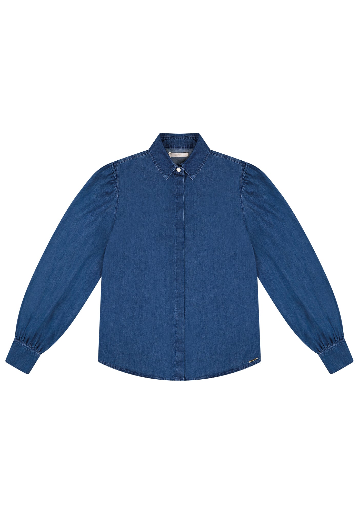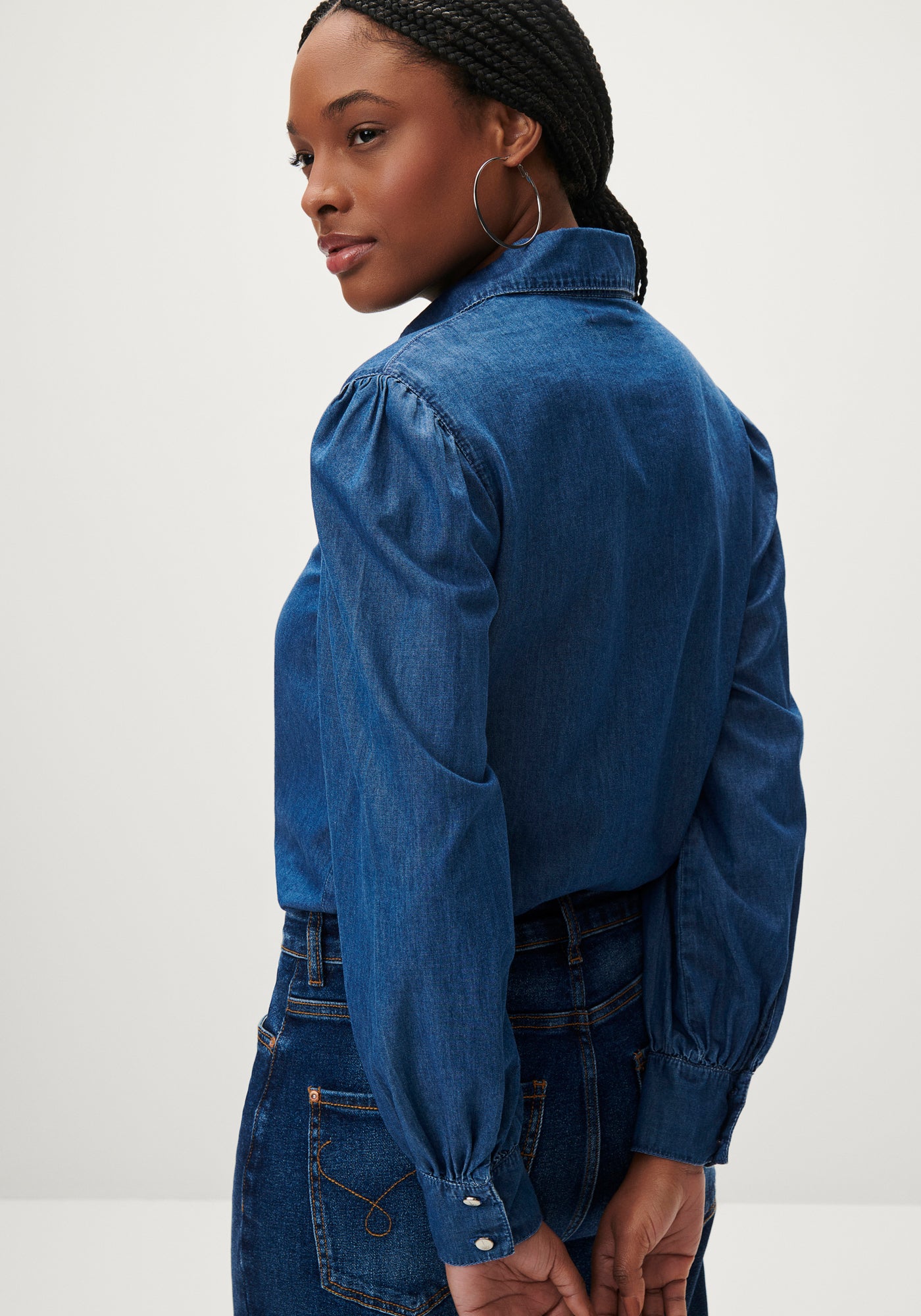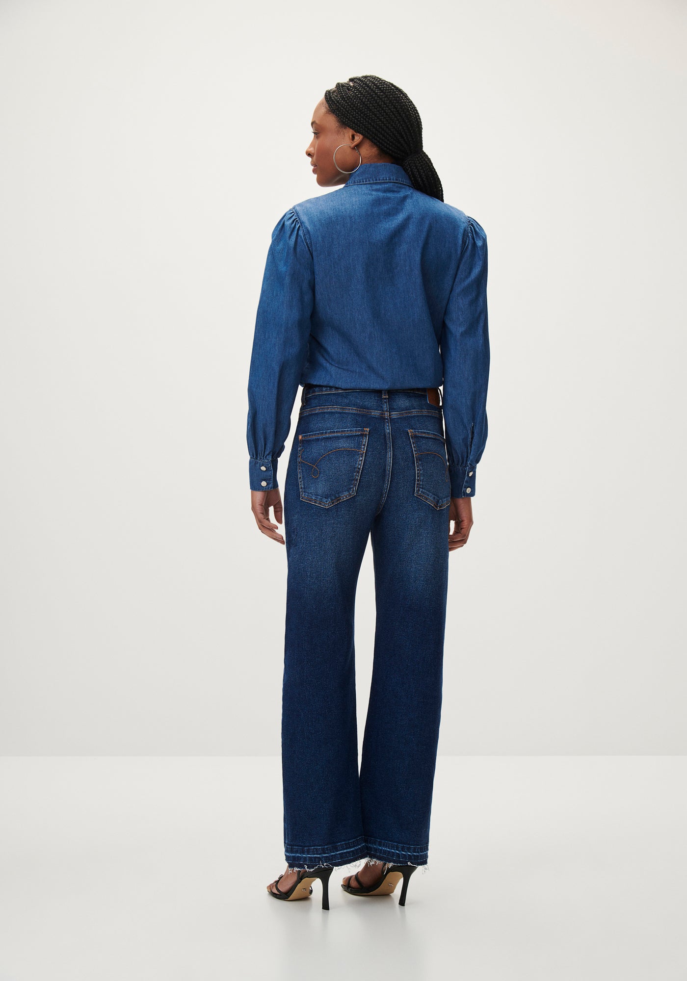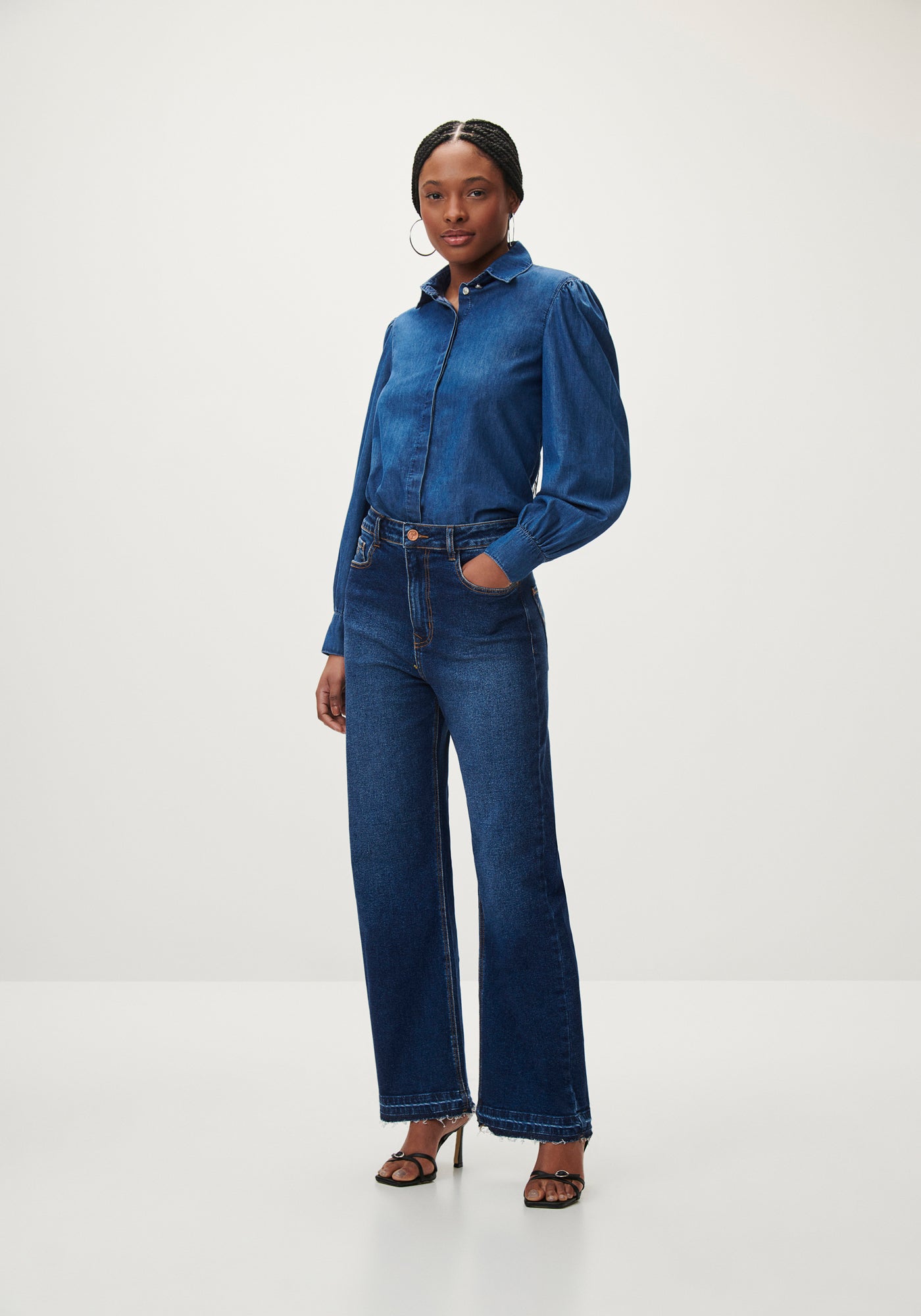 Confeccionada en tejido vaquero. Esta pieza tiene un corte ligeramente holgado, entrepierna incorporada con vista superpuesta y cierre de botón, así como mangas largas abullonadas con flecos en los hombros y puños más anchos con cierre de botón.