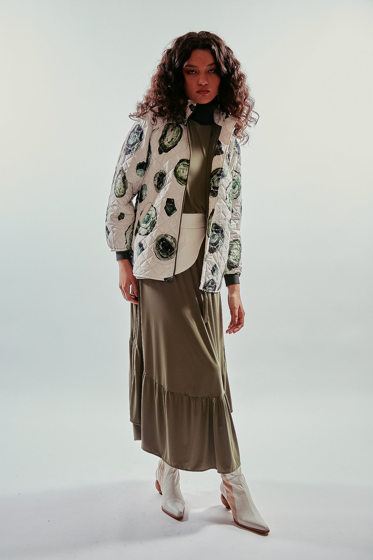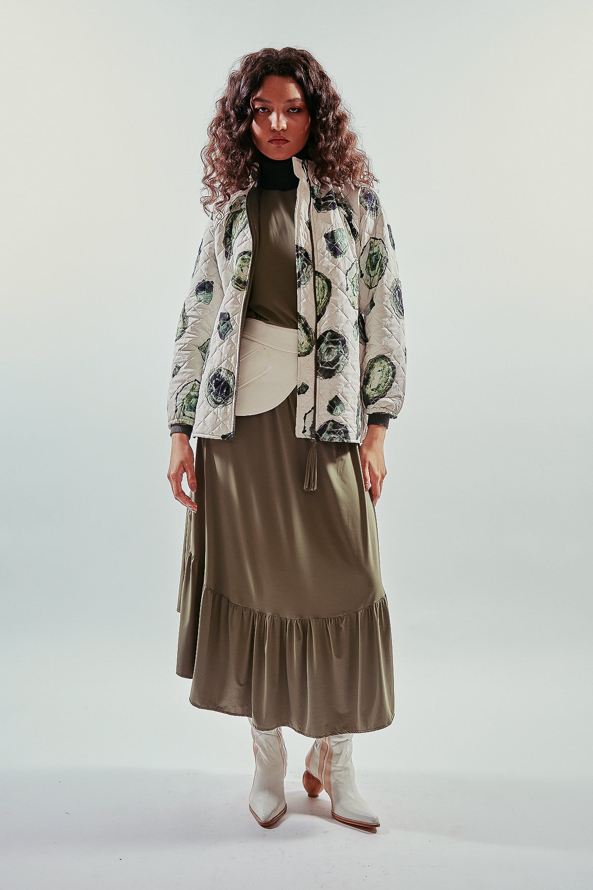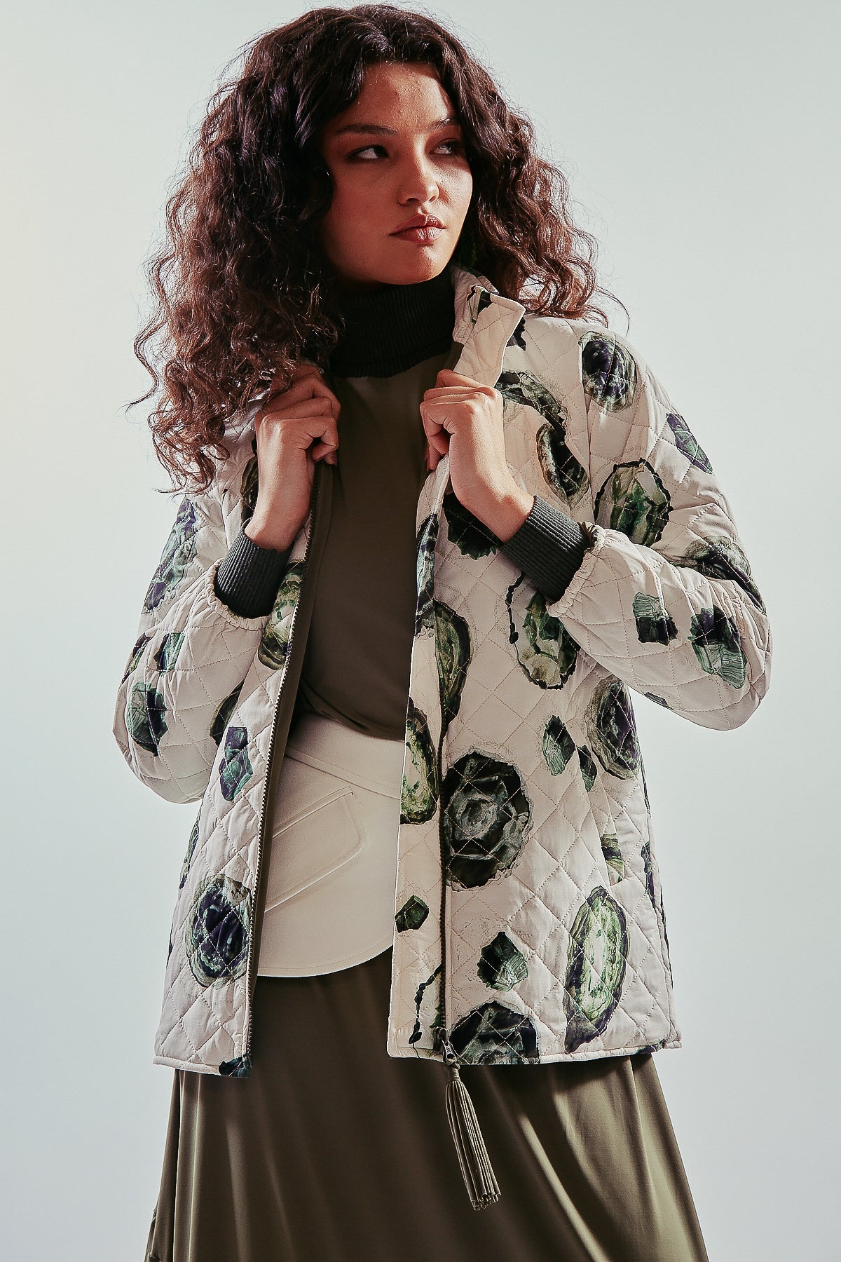 Cazadora blanca estampa esmeraldas y bolsillos laterales