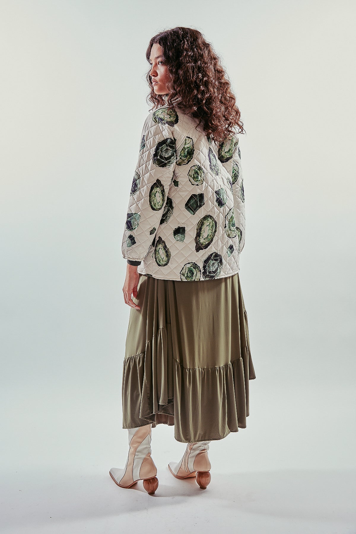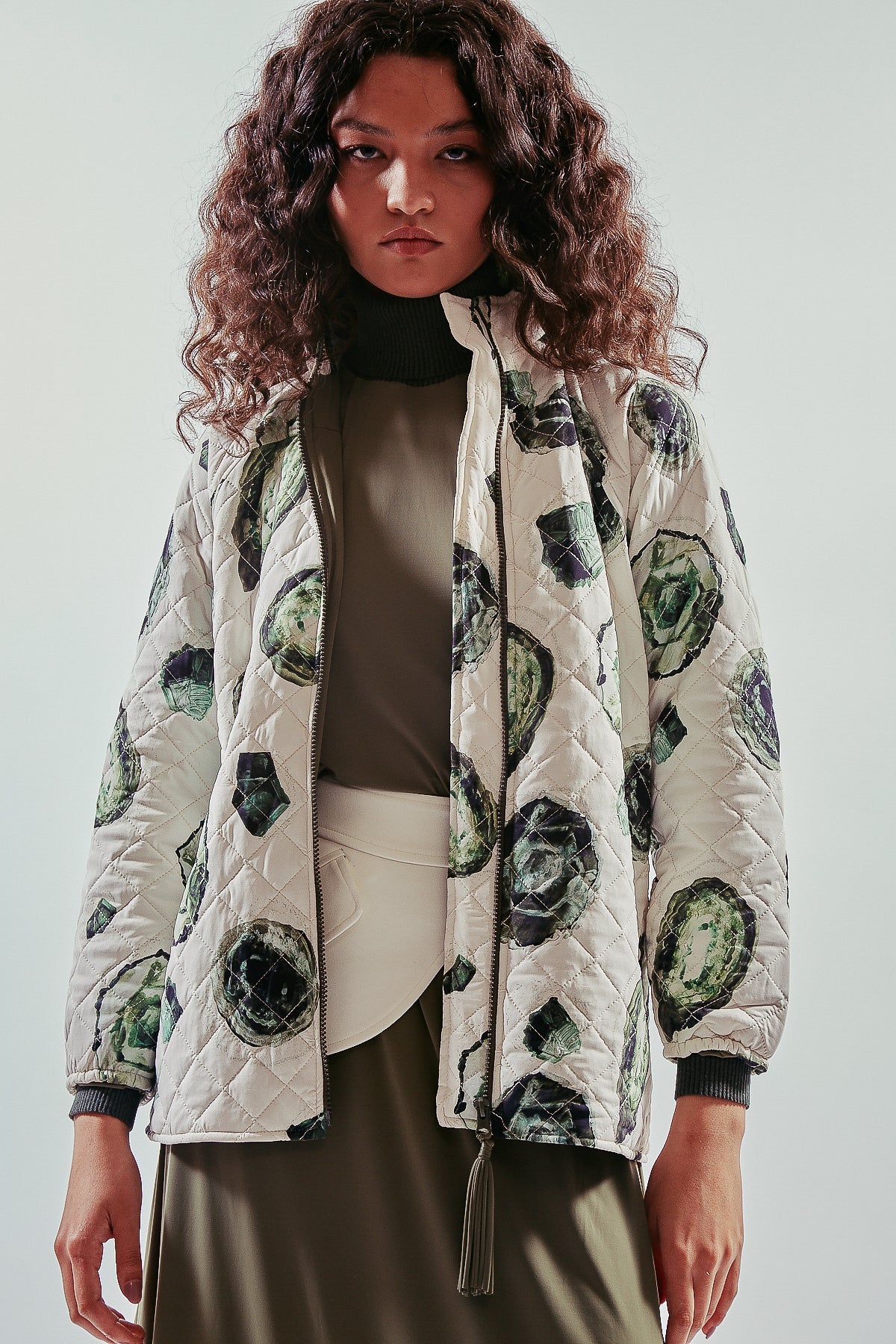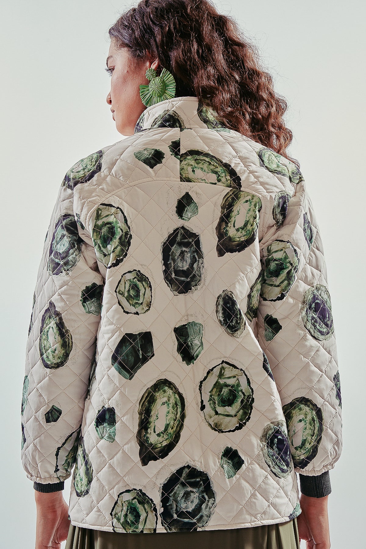 Cazadora de material exclusivo con fondo blanco, bolsillos laterales y estampa de esmeraldas.