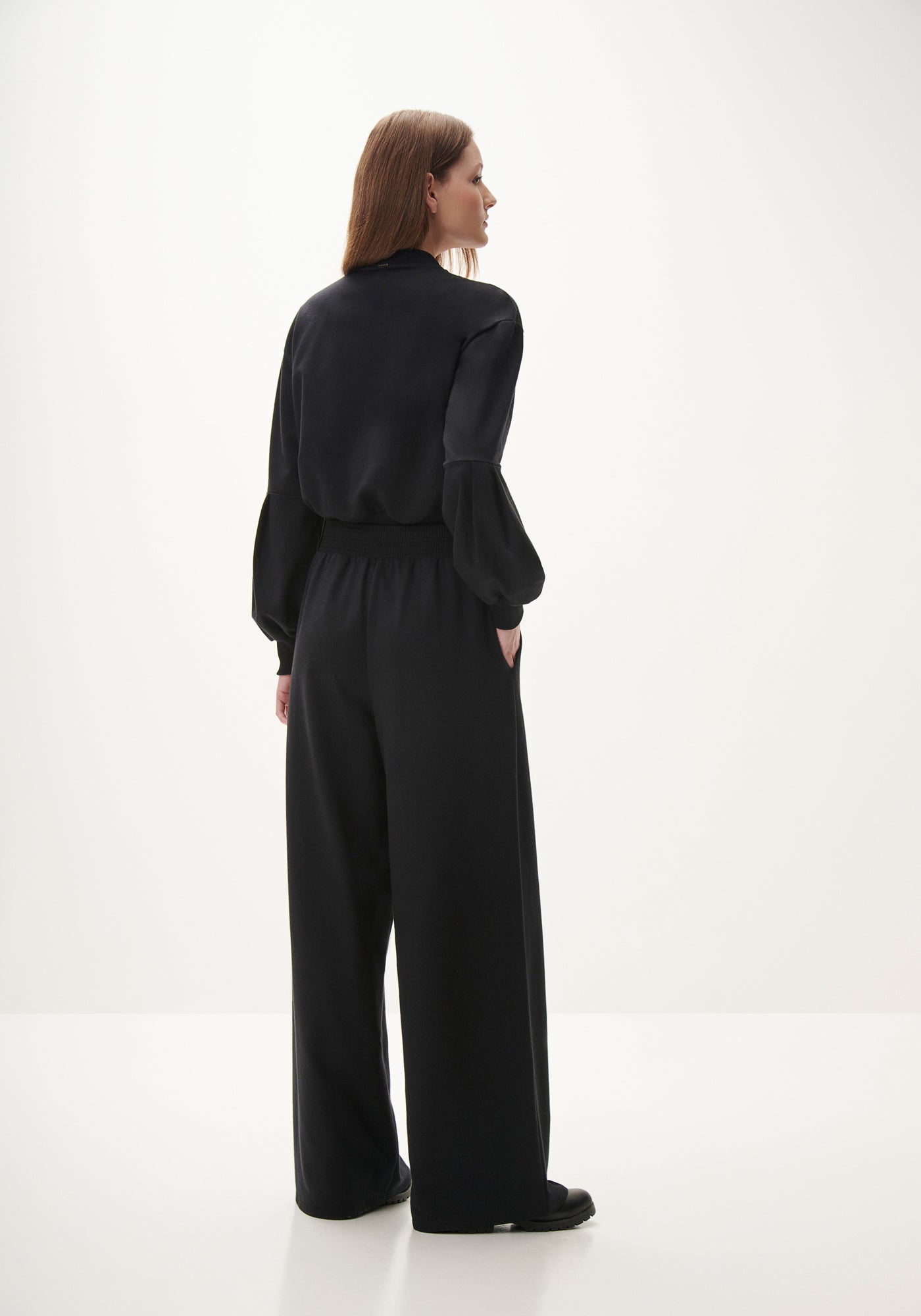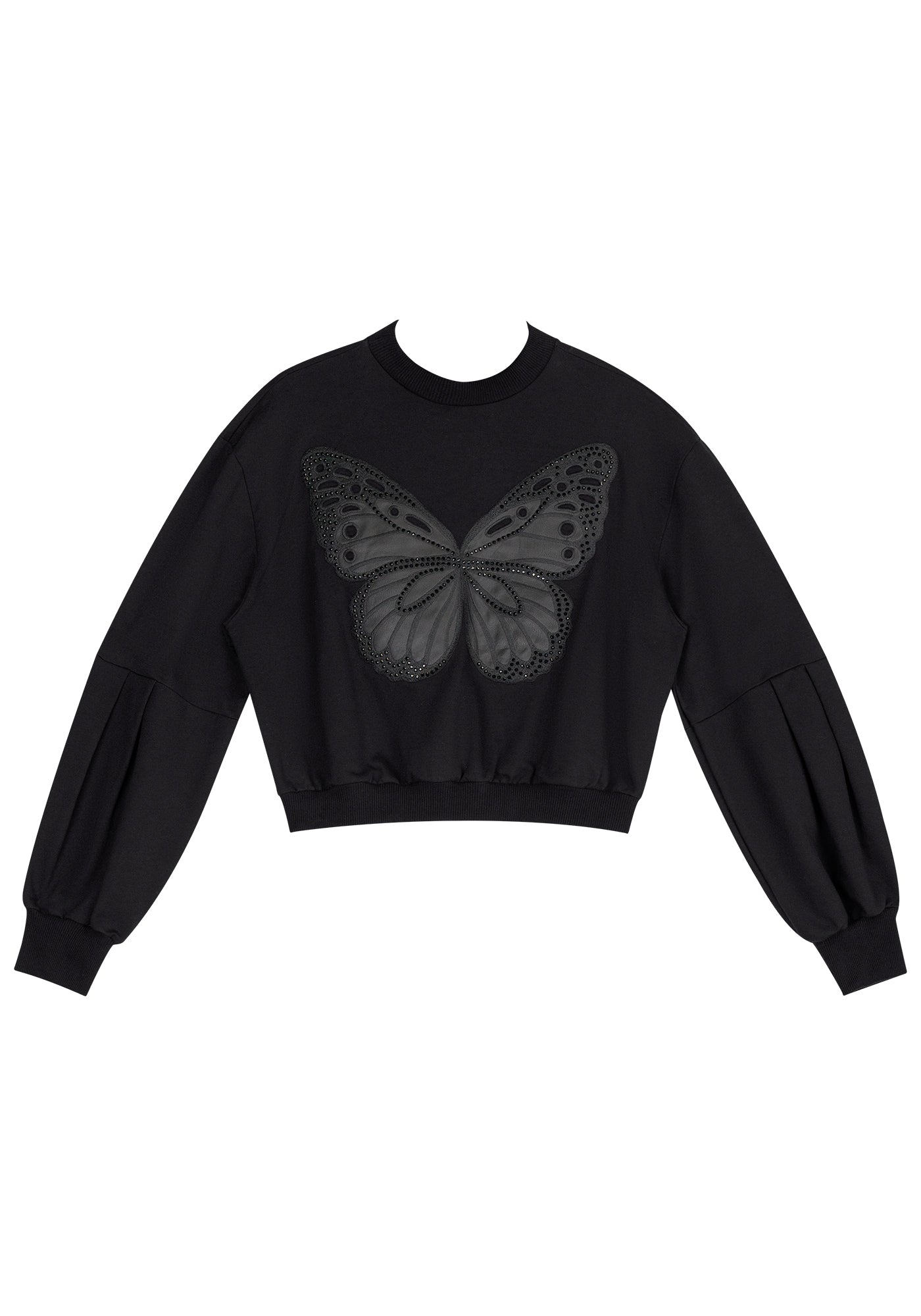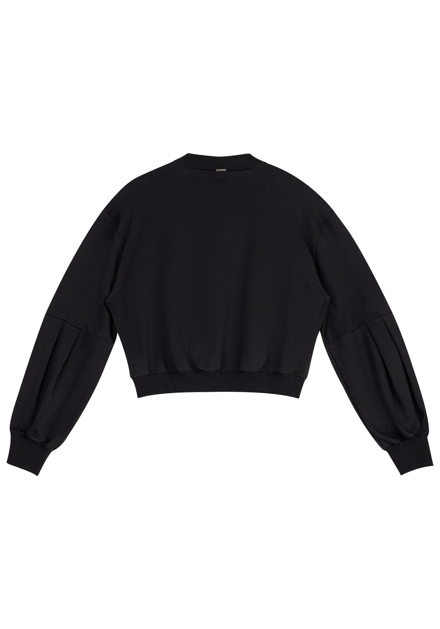 Confeccionada en Molecotton sin forro polar, con un peso medio, muy cómoda y sin pilling interno. Pieza con largo cropped, puños en el bajo, bordado PU con strass en la parte delantera, escote redondo y mangas largas con corte abullonado. *Algodón responsable que utiliza prácticas más sostenibles.