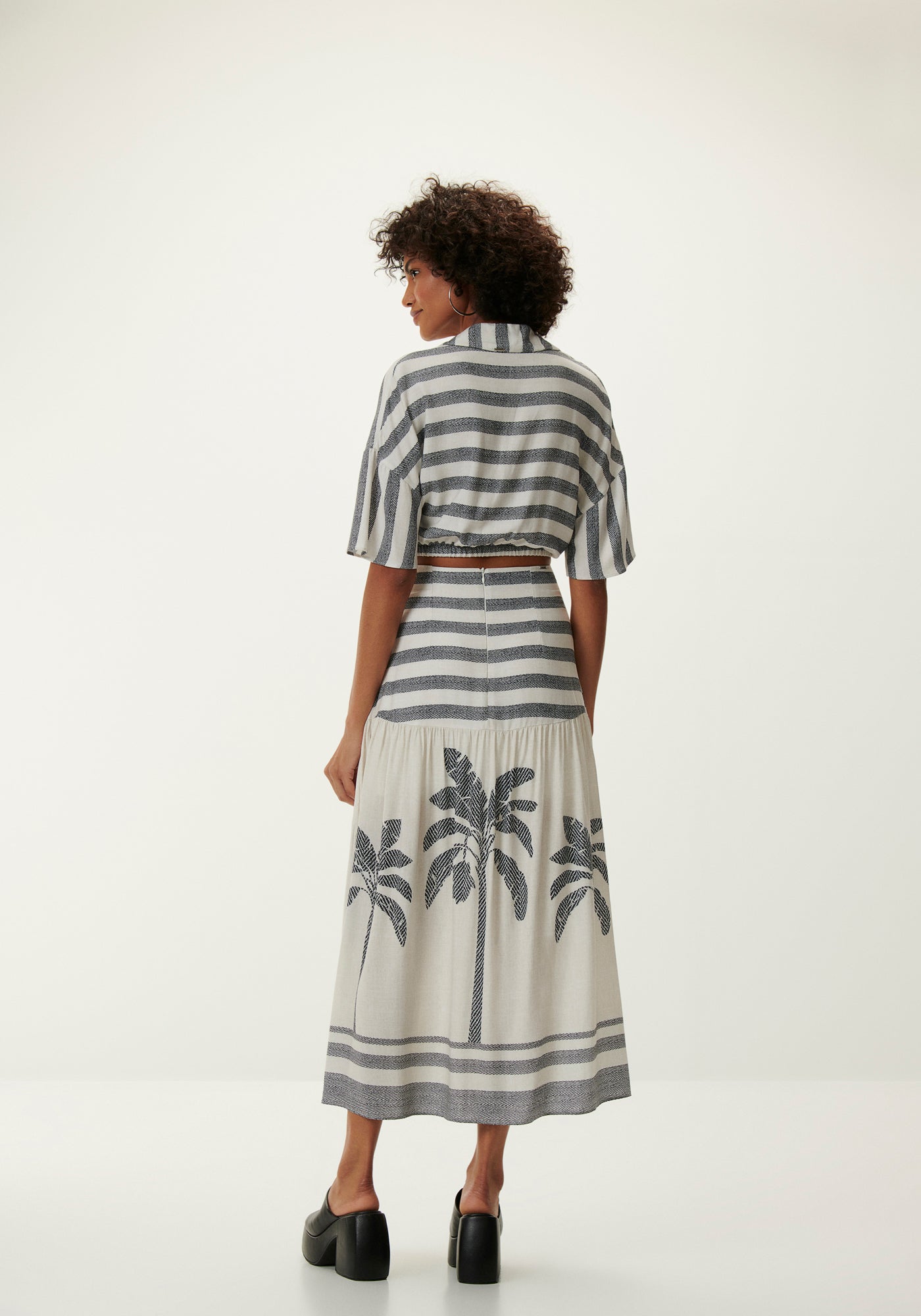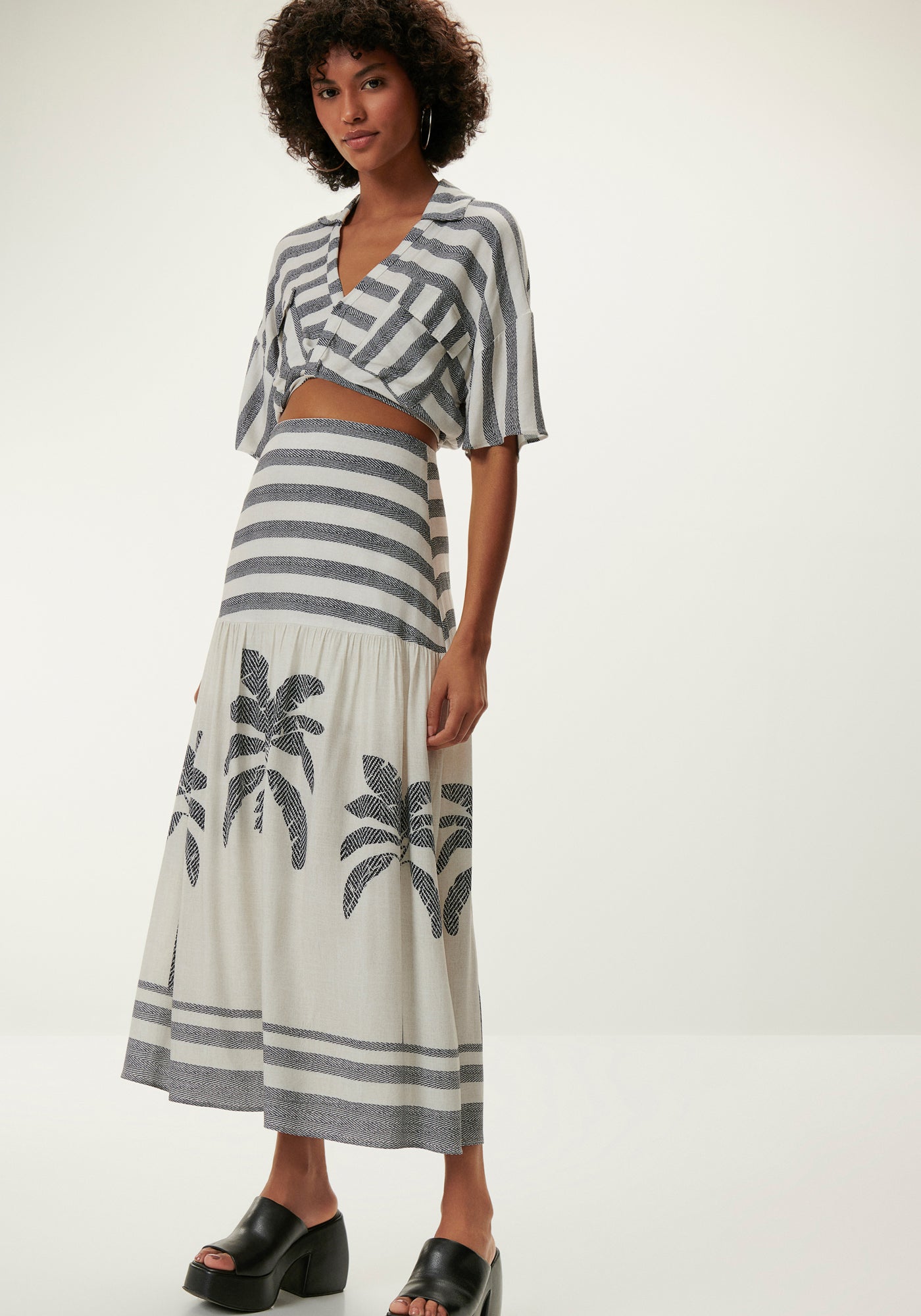 Confeccionada en tejido Rayon Bali, 100% viscosa responsable, de tacto suave y ajuste ligero. Pieza con largo midi, corte godê con flecos, cintura alta, caderas más entalladas con forro, cierre de cremallera en la espalda y Mosaico (sublimación localizada que permite ajustar perfectamente el diseño según el modelo). *Viscosa responsable que utiliza prácticas más sostenibles.