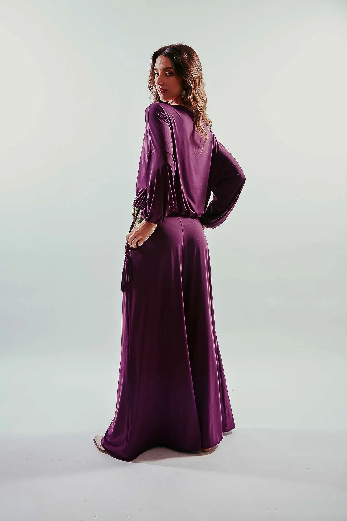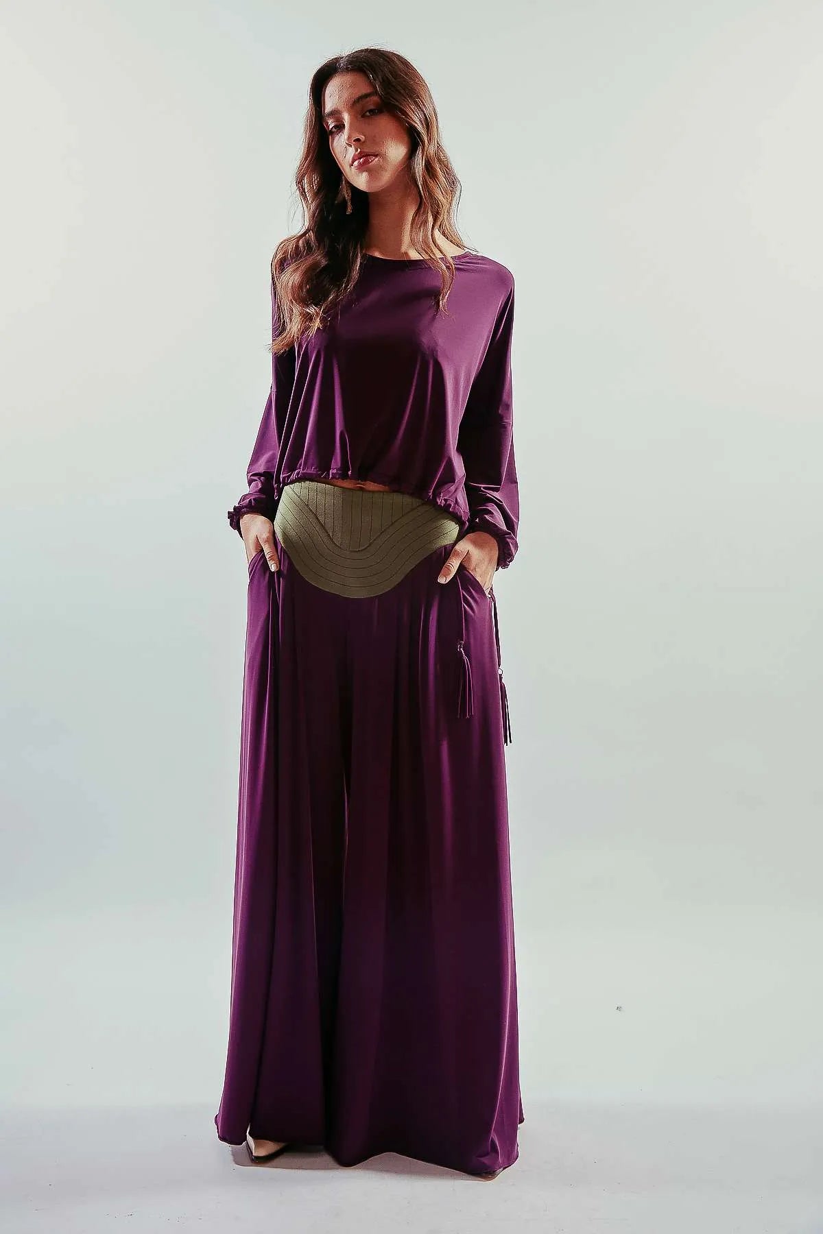 Pantalón largo bicolor morado y verde con pata elefante, cintura elástica, cremallera lateral y bolsillos.