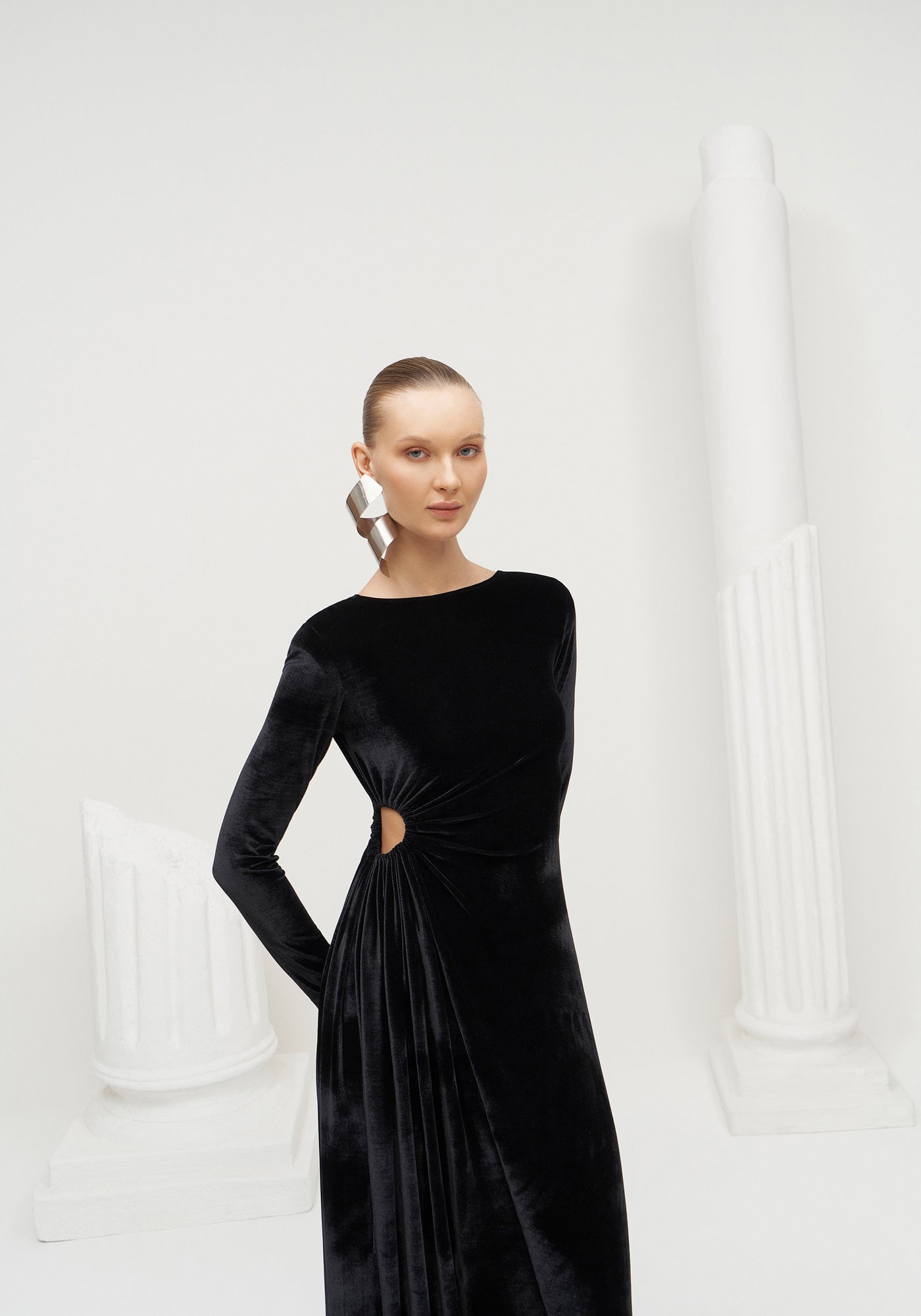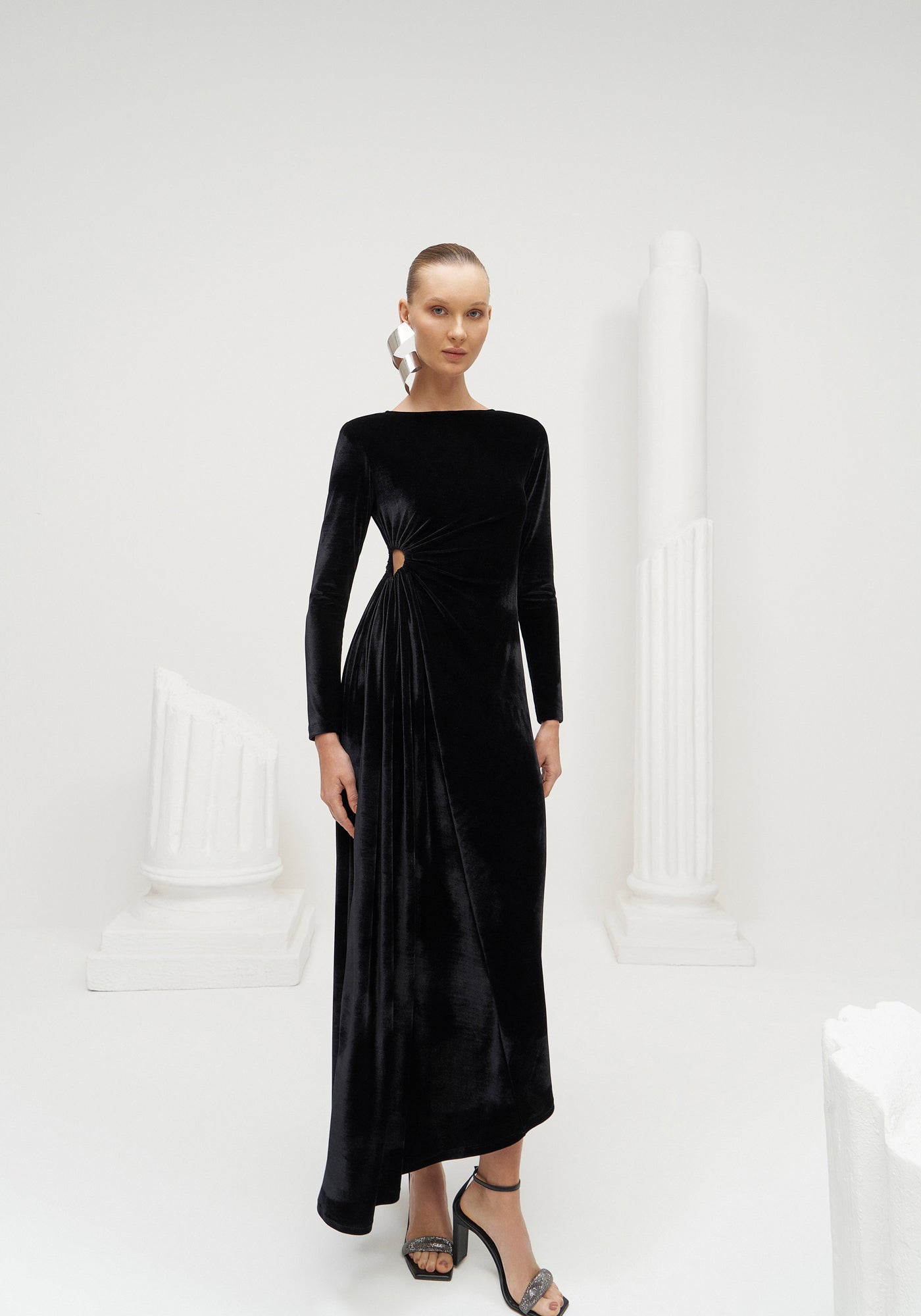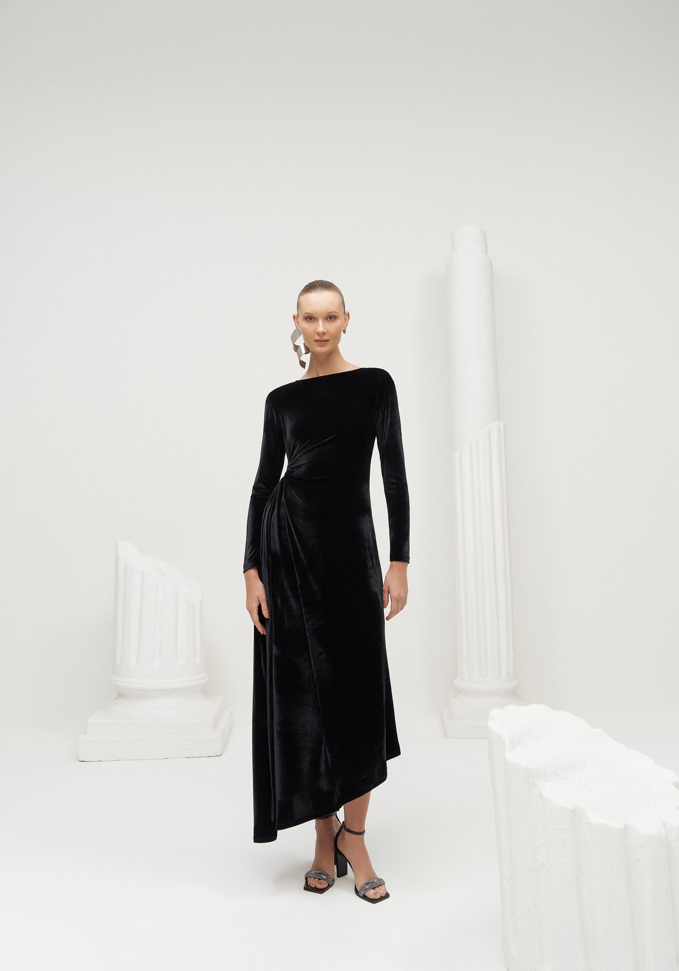 A través de la tendencia asimétrica que combina modernidad y sofisticación, este vestido de manga larga es una oda a la elegancia contemporánea. El terciopelo alemán, con su textura única, añade un toque distintivo, completado por el corte que realza la cintura. Perfecto para looks versátiles con atrevidas botas o sandalias metalizadas.