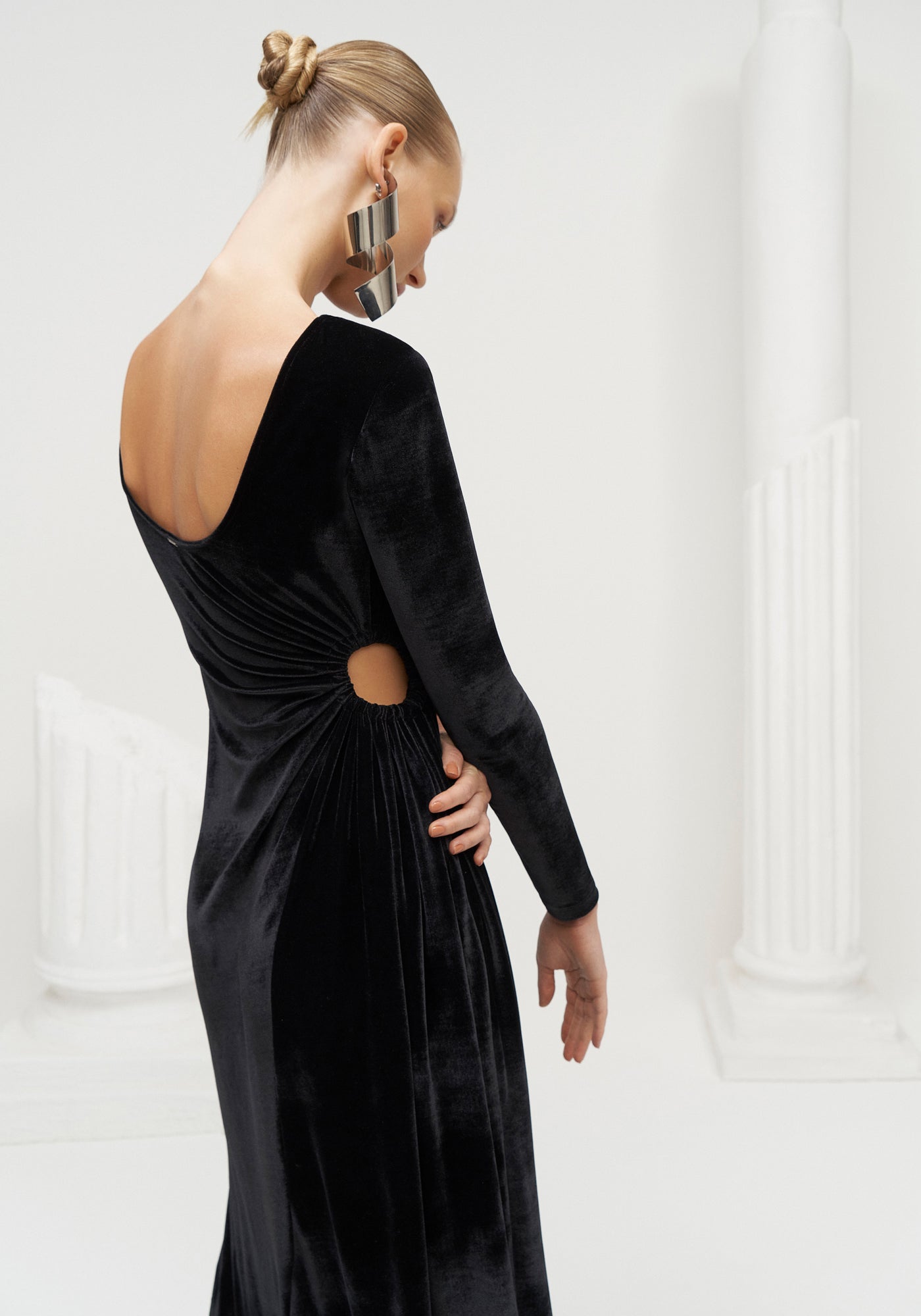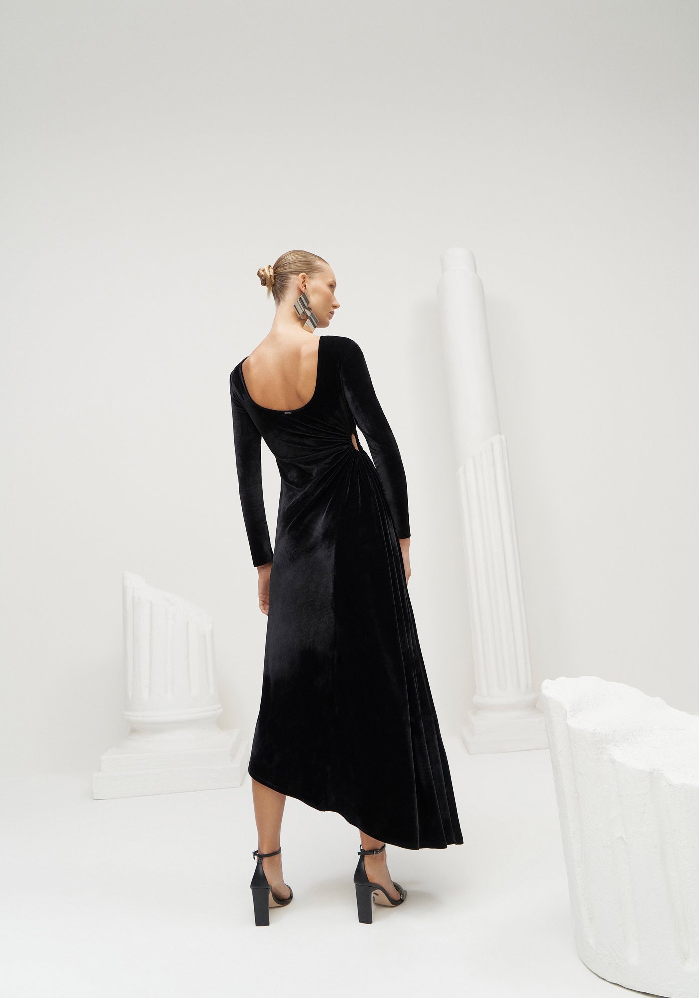 Confeccionado en terciopelo alemán de tacto muy suave, aspecto afelpado y efecto mojado. Pieza de la colección Atempo con un largo dobladillo asimétrico en diagonal, un escote delantero más cerrado, un escote en U en la espalda y un corte en la cintura con volante y efecto godé en el lateral.