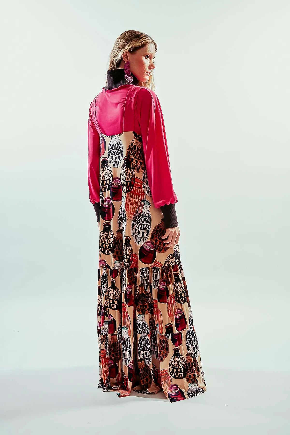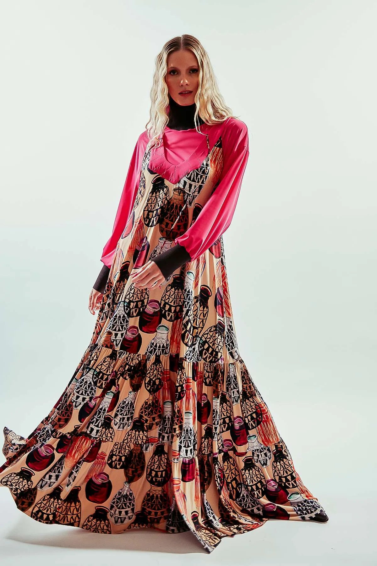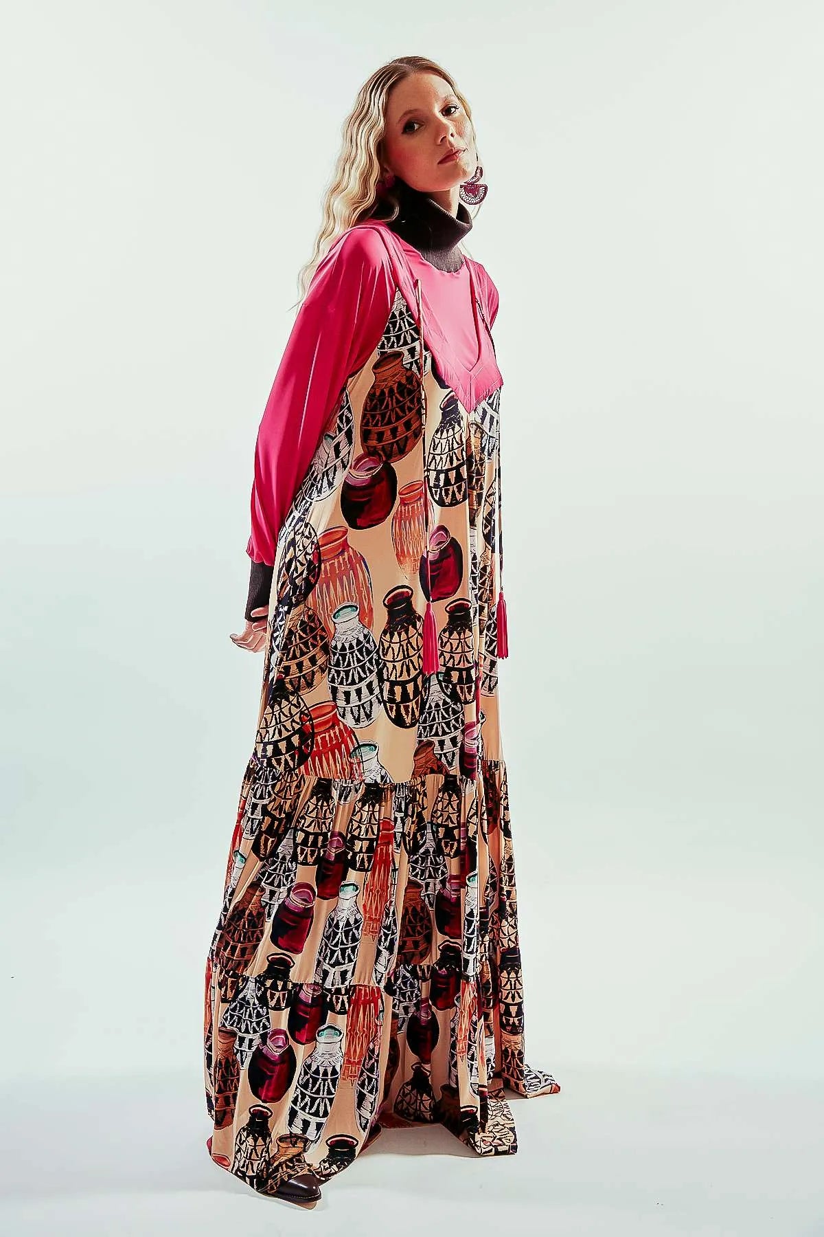 Vestido largo de tirantes rosas y escote rosa, vuelo en zona inferior, estampado con jarrones rusticos y fondo Marrón claro .